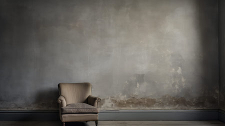 empty bedroom featuring a chair in the corner, designed with a light indigo and dark gray color scheme. the room showcases polished concrete flooring, leatherhide accents, and eco-friendly craftsmanship. captured with a konica auto s3 camera, the photo exudes a minimalistic serenity, enhanced by moody tonalism. ai generated