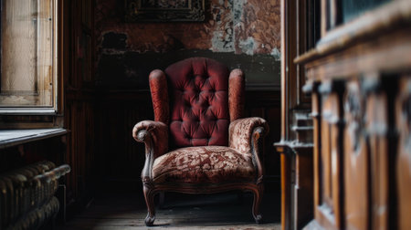 Tattered fabric draped over a worn-out chair soft diffused light nostalgic mood medium shot vintage interior, Realistic Photo