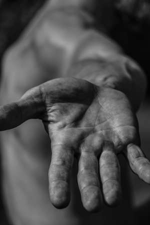 Dirty hands miner holding coal in black and white photo.Heavy coal mining
