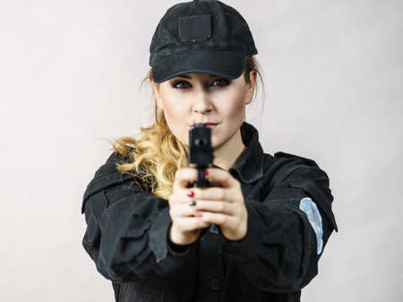 Young woman in uniform stands and aims with handgun in her hand against gray background. portrait.