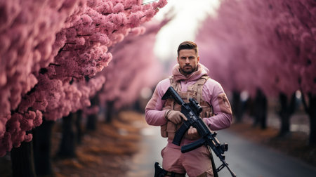 A man in a pink jacket and with a machine gun in his hand on a background of flowering trees