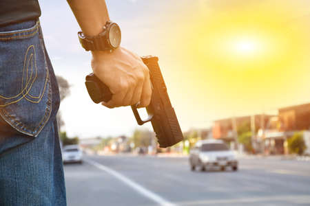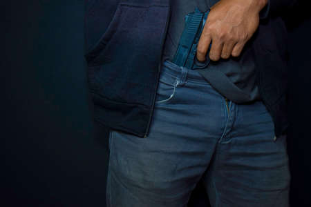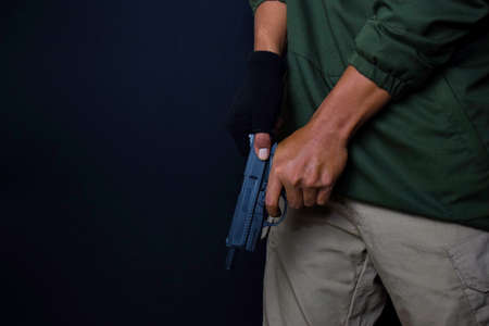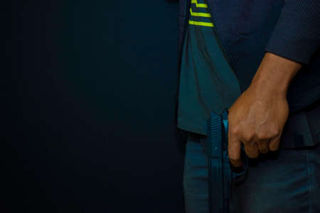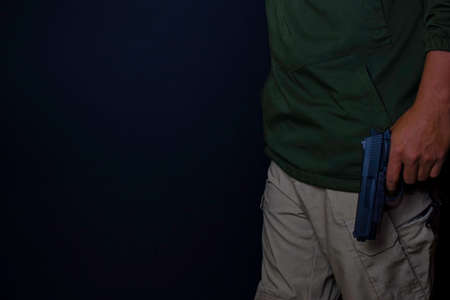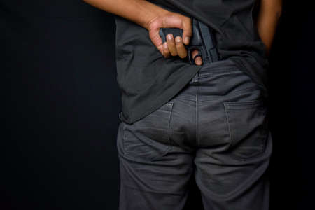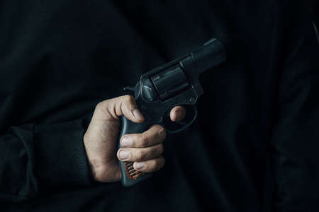 Man holds firearm behind his back. Person ready to attack with hand gun. Revolver in mens hand. Criminal concept.