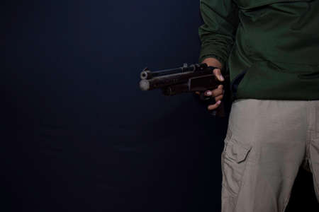 asian man holds a gun. Gun in his hand from the back isolated on black background.