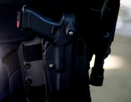Pistol in the holster. The shooter trains. Is preparing to shoot at the target