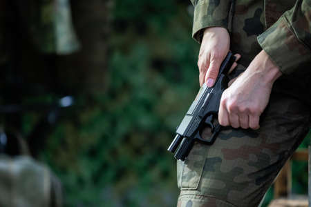 The soldier in the performance of tasks in camouflage holding a pistol with the hammer cocked takes aim for shot. War zone. Secret mission concept.