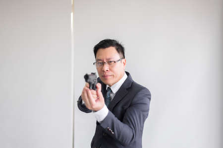 asian man holds a gun. Gun in his hand. Killed shooting his target isolated on black background.