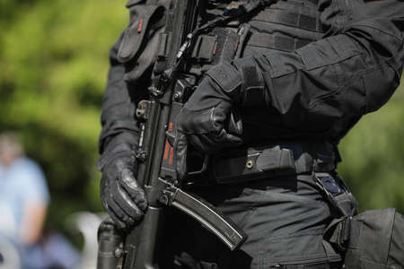 Bucharest, Romania - July 29, 2020: Details with an officer from the Special Actions and Intervention Service (SIAS), from the Romanian Police, holding a Heckler & Koch MP5