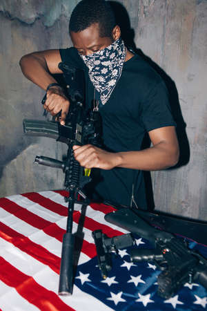 Black warrior is cleaning his rifle. Mercenary man with weapon in hand on dark gray background. Outlaw, ghetto, patriotic war, armed attack concept