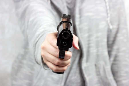 Caucasian woman hand holding a weapon ready to shoot. Gun violence, crime and murder concept.