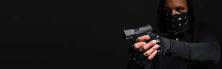 Unrecognizable armed black rapist closeup studio shoot. Gangster man with gun in hand on dark background. Outlaw, ghetto, murderer, robbery concept