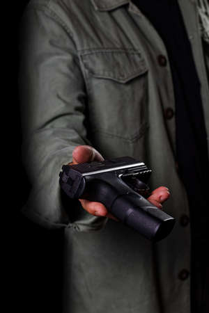 Man handover a black gun on black background. Closeup hand giving a gun. Shallow focus.
