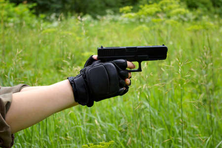 Strong Men's hands hold a gun against forest background. Danger situation in the forest