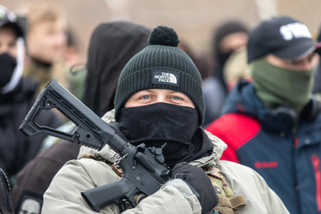 KYIV, UKRAINE - Feb. 06, 2022: Territorial defense exercises amid the threat of a Russian military invasion of Ukraine. Military exercises for civilians in Kyiv, Ukraine