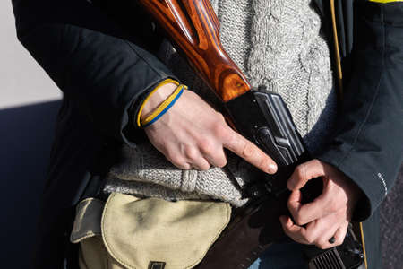 KYIV, UKRAINE - Feb. 27, 2022: War of Russia against Ukraine. Fighters of the battalion of territorial defense of the city of Kyiv