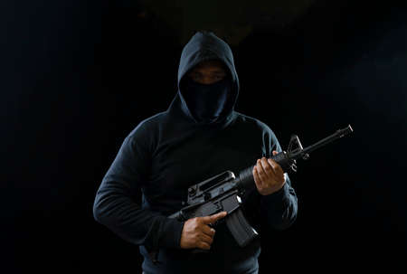 Robber with a gun robbing intimidate.Crime and robbery concept.