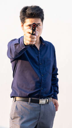 A young Asian man in a blue shirt holds a gun in his hand. White background.