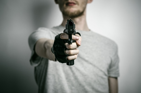 Horror and firearms topic: the killer with a gun in his hand in black gloves on a gray background