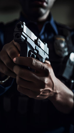 Portrait of Black Female Police Officer Aiming Gun at Criminal, Orders to Drop the Weapon and Stop Resisting Arrest. Officer of the Law Fights Crime, Prevents Murder. Cinematic