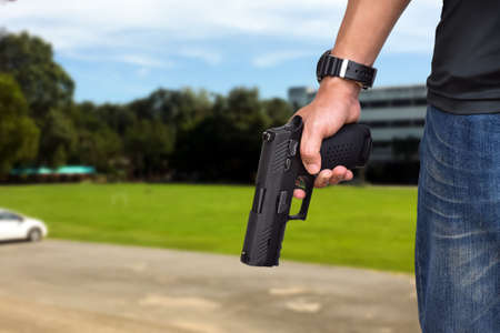 Close up on hand of unknown caucasian man holding a gun in by his leg while standing outdoor in sunny day - handgun criminal or self-defense concept with copy space