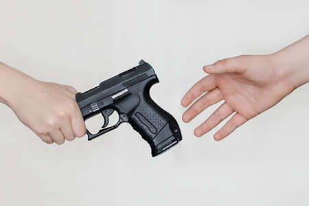 Pistol: transfer of a weapon, a pistol from hand to hand, against a light background.