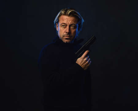Shadowy night portrait of a confident man with a gun in his hand with blond hair, a stubble beard and a black wool sweater.