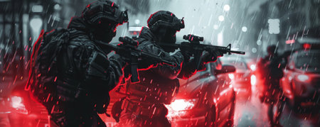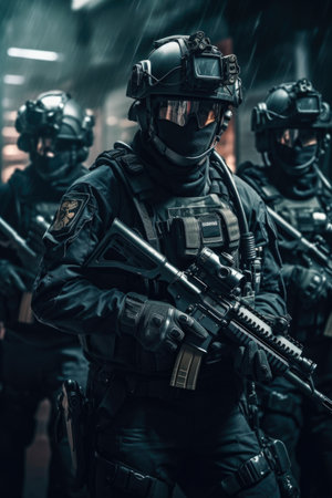 A special forces soldier polices group with high technology gun and weapon working in night city. Generative Ai