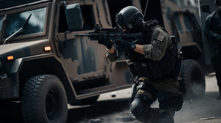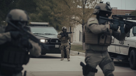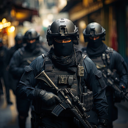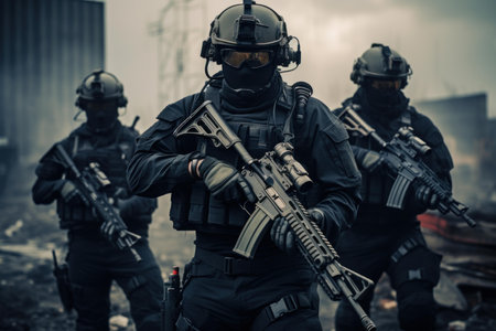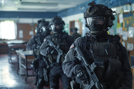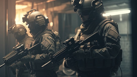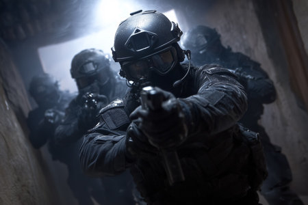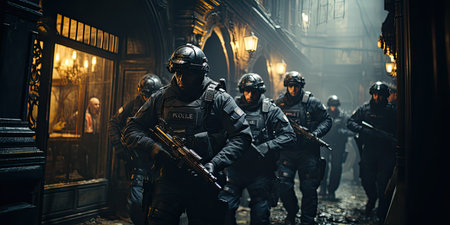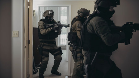Intense swat team action scene with officers in tactical gear and assault rifle readiness