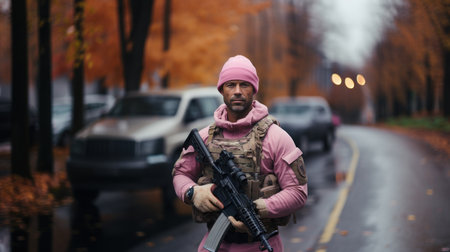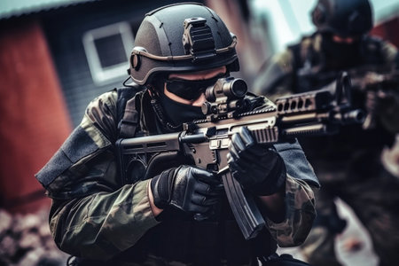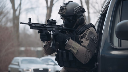 A police officer in uniform ensures public safety by holding a gun., Modern army special forces soldier police, swat team member, AI Generated
