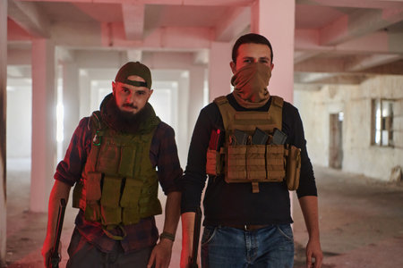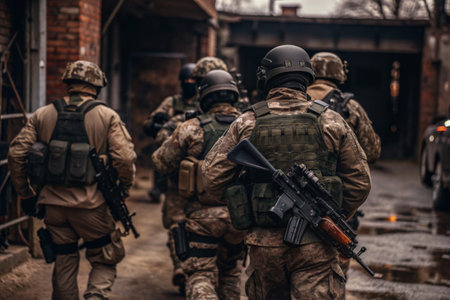 Fully equipped soldiers taking aim and advancing during an urban warfare operation