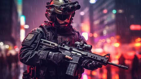 Portrait of a special forces soldier with assault rifle in the night city