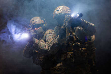 Two special forces soldiers in action with assault rifle in dark room.