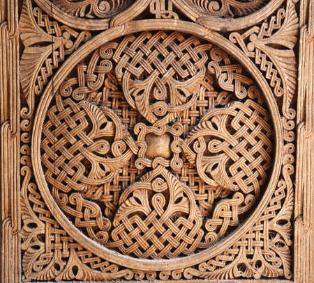Gothic patterns on a wooden board, wood carving. Close-up details of the Dominican monastery in Dubrovnik.
