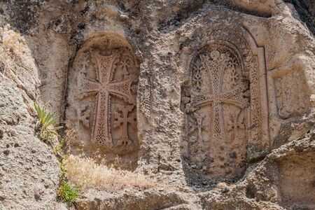 Crosses carved into a rock at Geghard monastery in Armenia