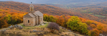 Stone church standing on a hilltop, overlooking a vast valley filled with colorful autumn trees, creating a serene and picturesque landscape