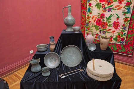 Azerbaijan Baku 04.12.2020 . Various amphorae exhibited in the national arcaeological museum . Copper pottery exhibition . Sernic . Satil .Tray . Filter. Boiler . pottery river . jug . wool comb