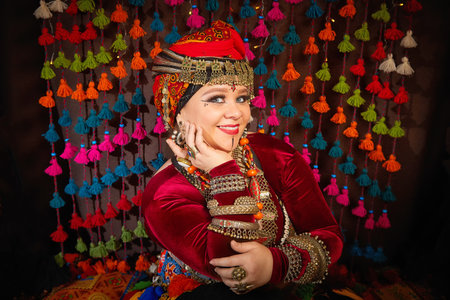 SHYMKENT, KAZAKHSTAN - MARCH 22, 2023: Kazakh girl in a traditional festive Kazakh costume at celebration of Nauryz