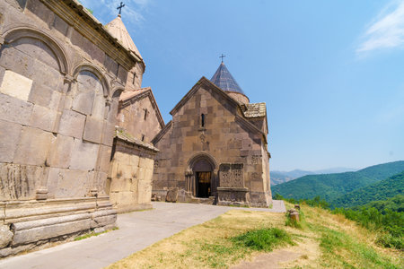 Kotayk, Armenia - 10 April, 2017: The monastery of Geghard is a architectural construction in the Kotayk province of Armenia. listed as a UNESCO World Heritage Site.