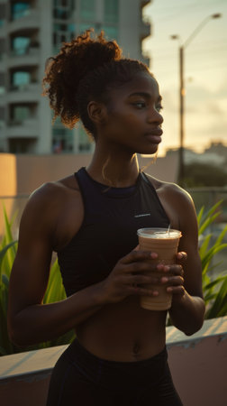 Athletic Woman Enjoying Protein Shake at Sunset on Urban Balcony
