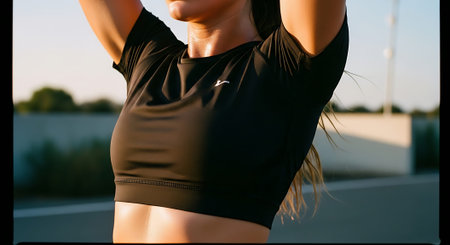 A woman in a black sports bra with a white logo stretches her arms upwards outdoors during what appears to be either sunrise or sunset.