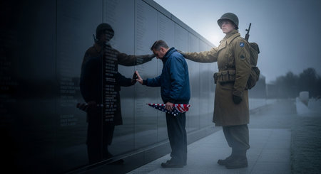 Soldier comforting grieving man touching the Vietnam war memorial. Remembrance and grief at solemn memorial site.