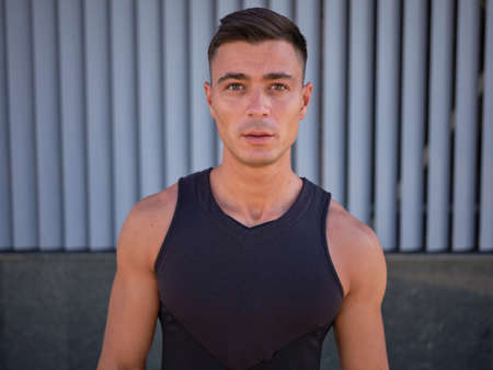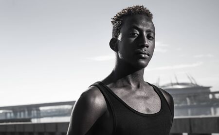 Portrait of Black young man with perfect body doing hard workout outdoors.