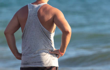 Young adult male flexing his bicep muscles shirtless on a warm summer's day