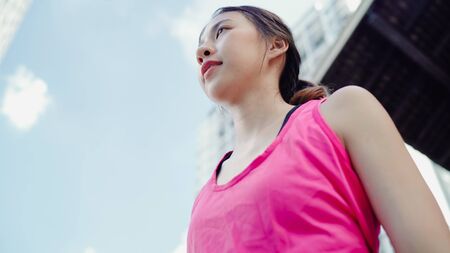 Healthy beautiful young Asian Athlete women in sports clothing legs warming and stretching her arms to ready for running on street in urban city. Lifestyle active women exercise in the city concept.