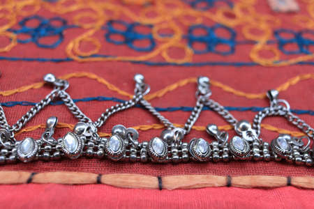 Indian silver anklets on the background of a traditional patchwork carpet. in indian background.