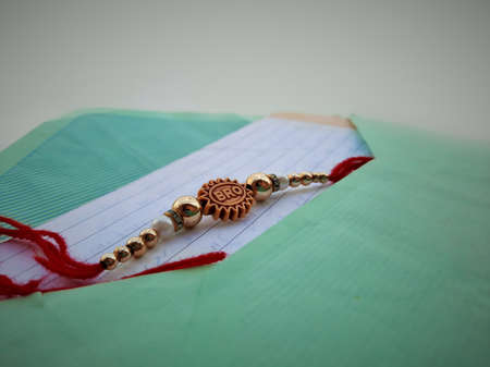 closeup of Rakhee or holy thread with message in envelope on Raksha Bandhan