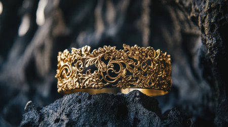 This stunning gold crown features an intricate floral design, beautifully displayed against a dark rocky background, ideal for showcasing luxury and elegance.