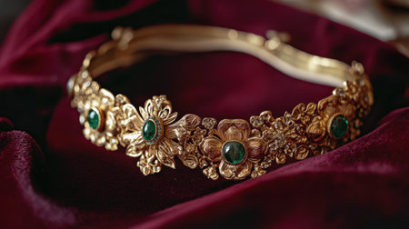 This exquisite gold crown features intricate floral designs adorned with emerald stones, resting elegantly on deep burgundy velvet. Perfect for luxurious occasions.