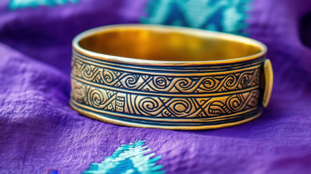 A stunning bronze bangle featuring intricate designs that reflect rich craftsmanship, set against a vibrant purple fabric backdrop. Perfect for showcasing unique style.