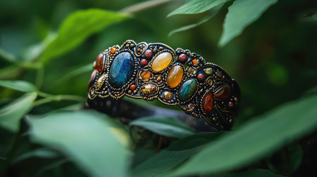 A captivating bracelet adorned with vibrant gemstones rests among lush green leaves, creating a striking contrast in this artistic jewelry photograph.