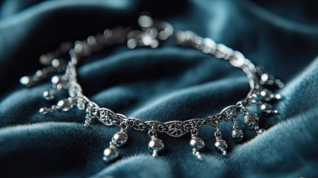 This stunning silver bracelet showcases exquisite craftsmanship with elegant dangles. It rests gracefully on a soft velvet background, emphasizing its beauty.